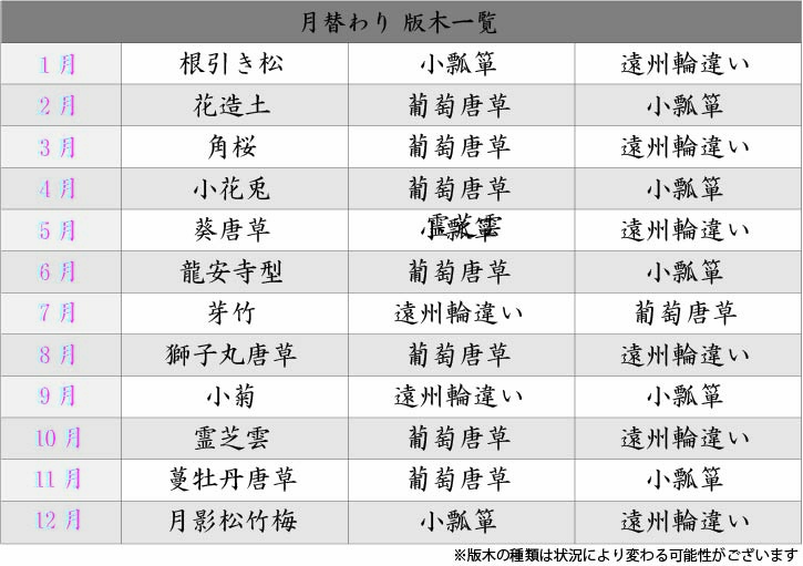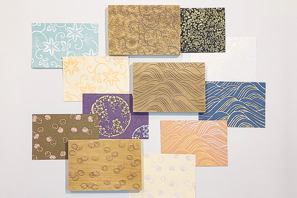 月替わりの版木3種類・絵具2色・和紙(鳥の子紙)15色以上を自由に組み合わせた自分だけの唐紙は、