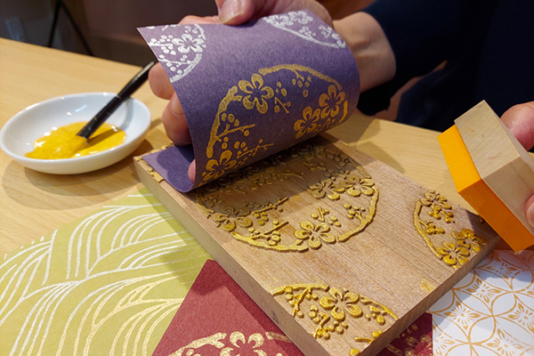 京からかみのミニ版木を用いてハガキサイズの唐紙文様を摺る体験です。