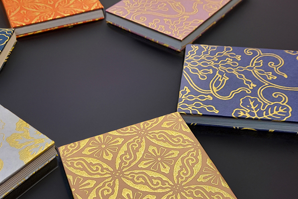 和紙(鳥の子紙)に京からかみ文様を摺り、御朱印帳を作る体験です。唐紙摺り体験と同様の唐紙を1枚摺り、御朱印帳へ仕立てます。