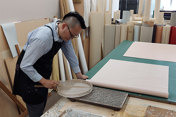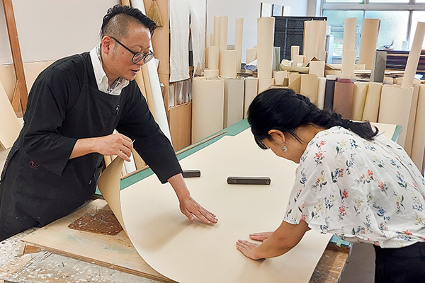 唐紙の工房見学と、100年以上前から受け継がれてきた版木を使って唐紙を摺る体験です。